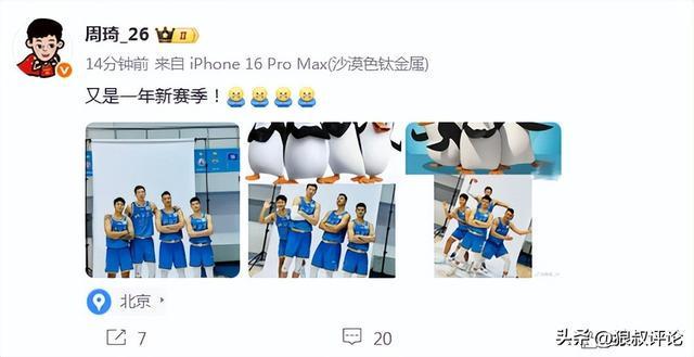19年男篮主力!周琦社媒晒新赛季定妆照:与赵睿、方硕翟晓川同框