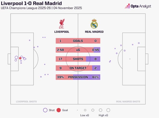 利物浦全场创造2.58的预期进球值,而皇马仅有0.45,红军堪称实至名归的胜利者。